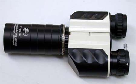 MAXBINO専用45°2倍 正立プリズムです。取付けは、MAXBINOの31.7mmスリーブをはずして、取り付けリングにネジ込みます。バックフォーカスは、通常より約26mmの延長をします。取り付けは簡単で、MAXBINOの取付けスリーブのTネジにねじ込むだけです。