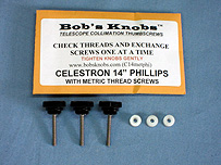 国際光器は、USAの便利パーツメーカー「Bob`s Knobs」製品をご紹介致します。「Bob`s Knobs」は指で回せるハンドル付きなので、今まで不便な光軸調整ネジが、工具レスで自由自在になります。標準装備の調整ネジ3本を1本ずつ「Bob`s Knobs」と交換するだけで、作業は数分程度で完了できます。弊社は先にセレストロン社シュミカセ鏡筒用の「Bob`s Knobs」で取扱いを開始をして、徐々に他機種用のネジも近日中に販売スタート致します。ネジの交換方法及び光軸調整の実際のやりかたについては、日本語マニュアルを添付していますので、ご安心して行なって頂けます。