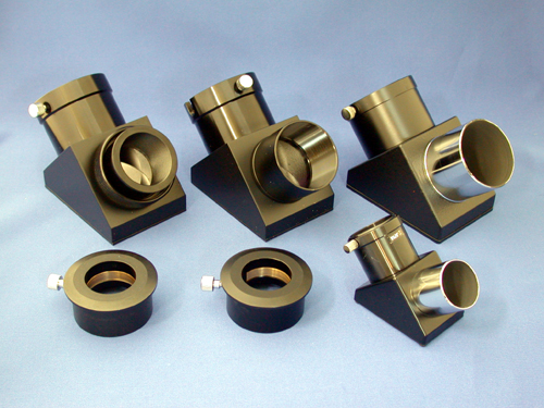 | 左上から時計回りに、オリジナル「シュミカセ専用」2インチ天頂ミラー「品番:2SCT」、オリジナル2インチ天頂ミラー「品番:2T(スリーブタイプ)」、(注:右側の国産2インチプリズム「品番:1052」は完売です)、オリジナル2インチ天頂ミラーに付属の2インチ→31.7mm変換アダプター、とビクセン製31.7mmサイズ天頂プリズム「品番:3675-04」です。 |