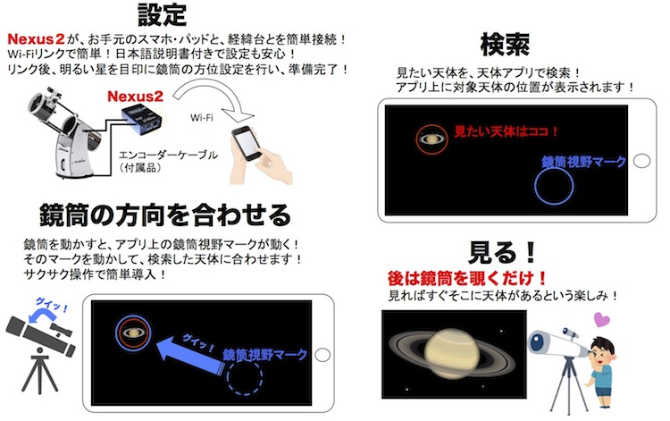 経緯台/赤道儀に装備しているエンコーダーを専用ケーブルと接続して、情報端末と無線Wi-Fiででリンクする、次世代型導入支援装置です。簡単に、気軽に、新感覚の星空観望が実現します。